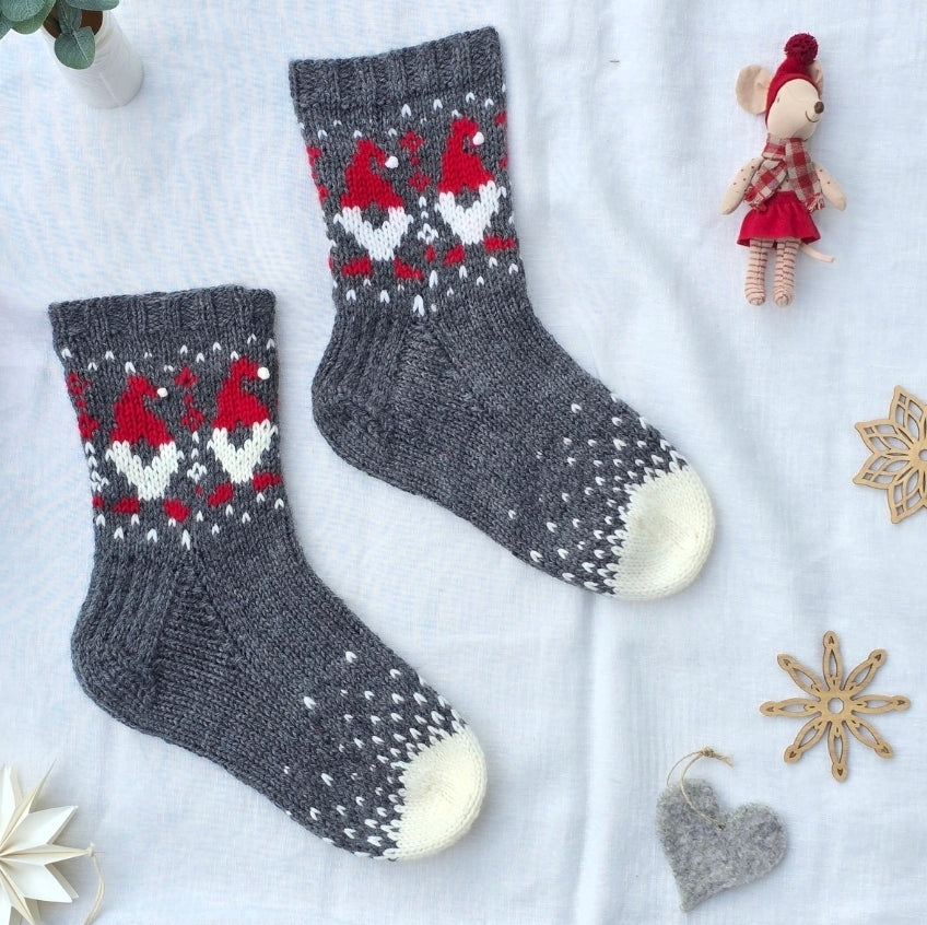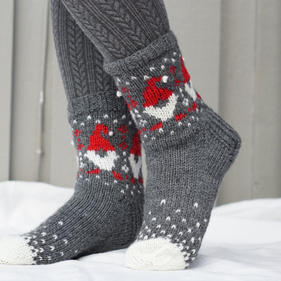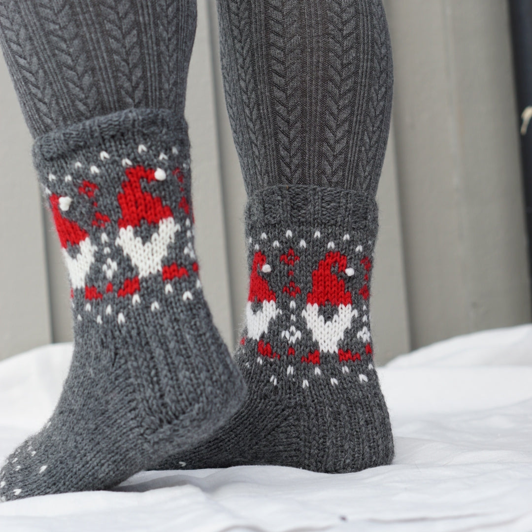 Kalle julesokker er inspirert av klassisk nordisk jul, med nisser, snømenn og snøkrystaller. Du kan velge mellom nissemønster eller snømann mønster på leggen. Sokkene strikkes i tykkere sokkegarn, og holder tærne gode og varme. Hælen strikkes med teknikken forsterket hæl, for å skape en tettere overgang mellom hæl og fot, i tillegg til at den danner en fin struktur.