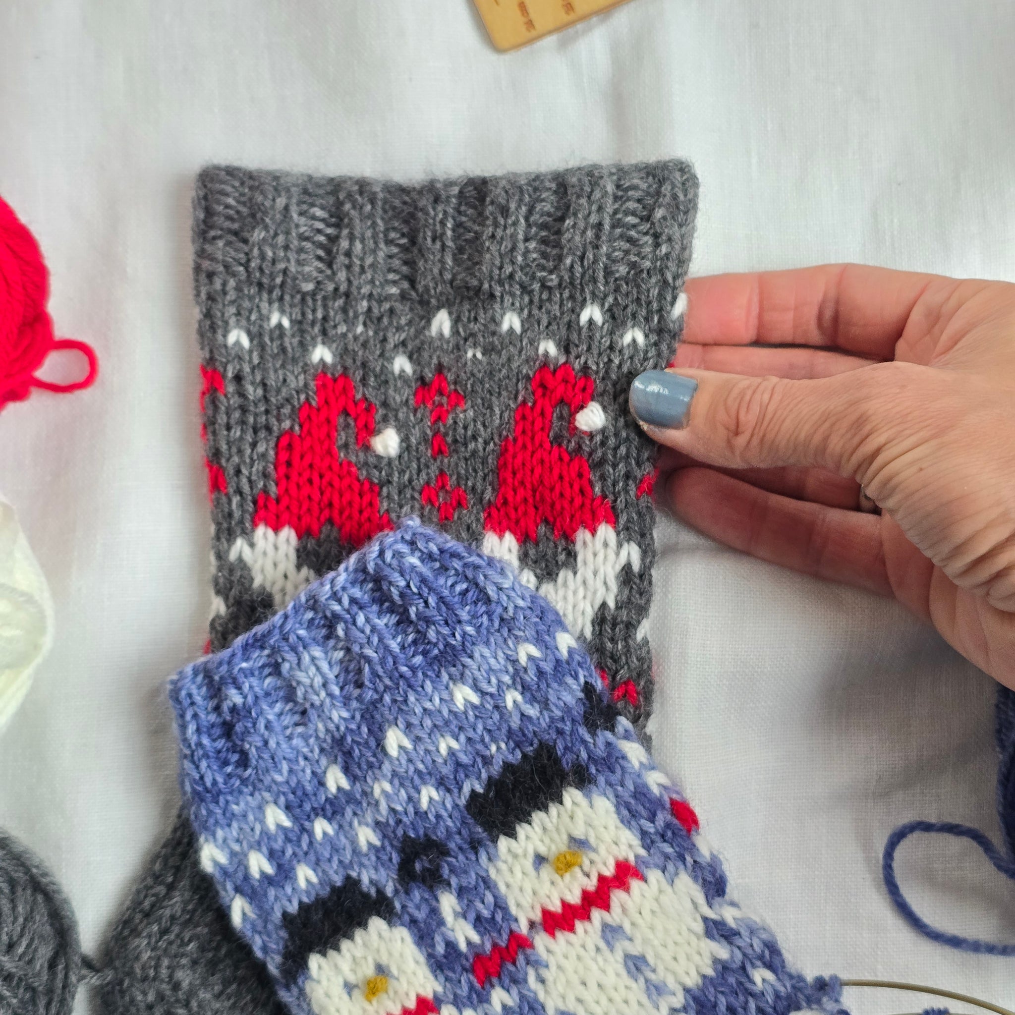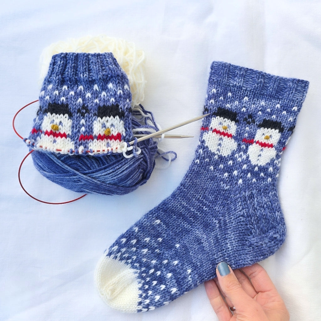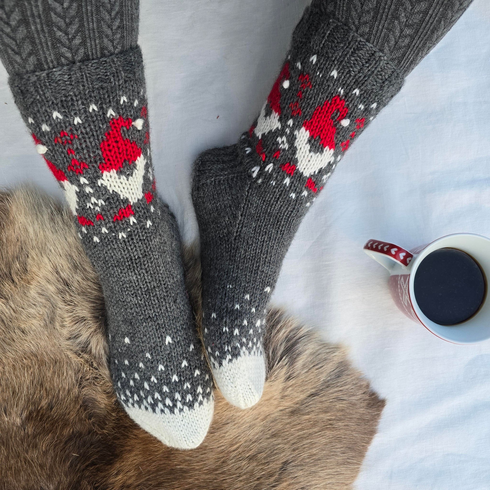 Kalle julesokker er inspirert av klassisk nordisk jul, med nisser, snømenn og snøkrystaller. Du kan velge mellom nissemønster eller snømann mønster på leggen. Sokkene strikkes i tykkere sokkegarn, og holder tærne gode og varme. Hælen strikkes med teknikken forsterket hæl, for å skape en tettere overgang mellom hæl og fot, i tillegg til at den danner en fin struktur.