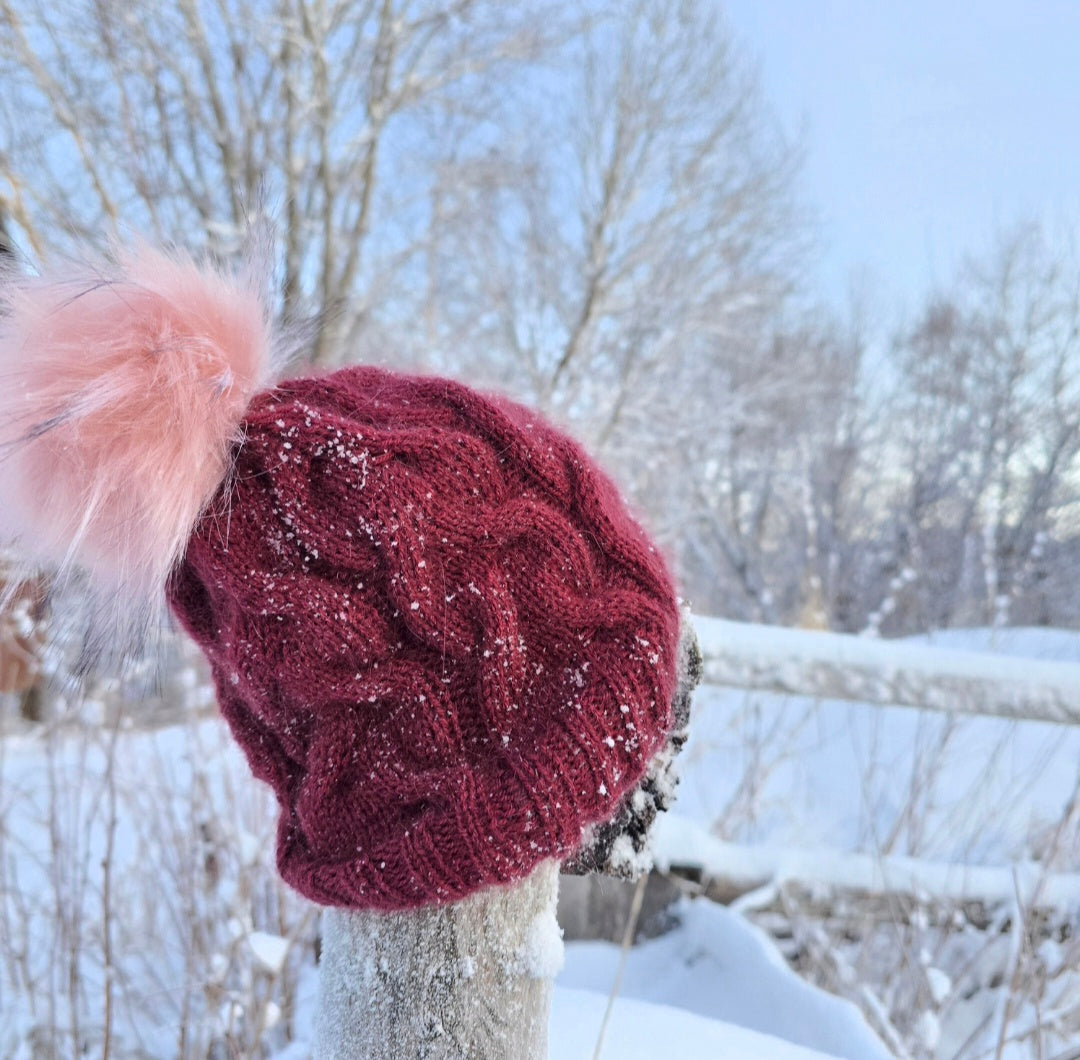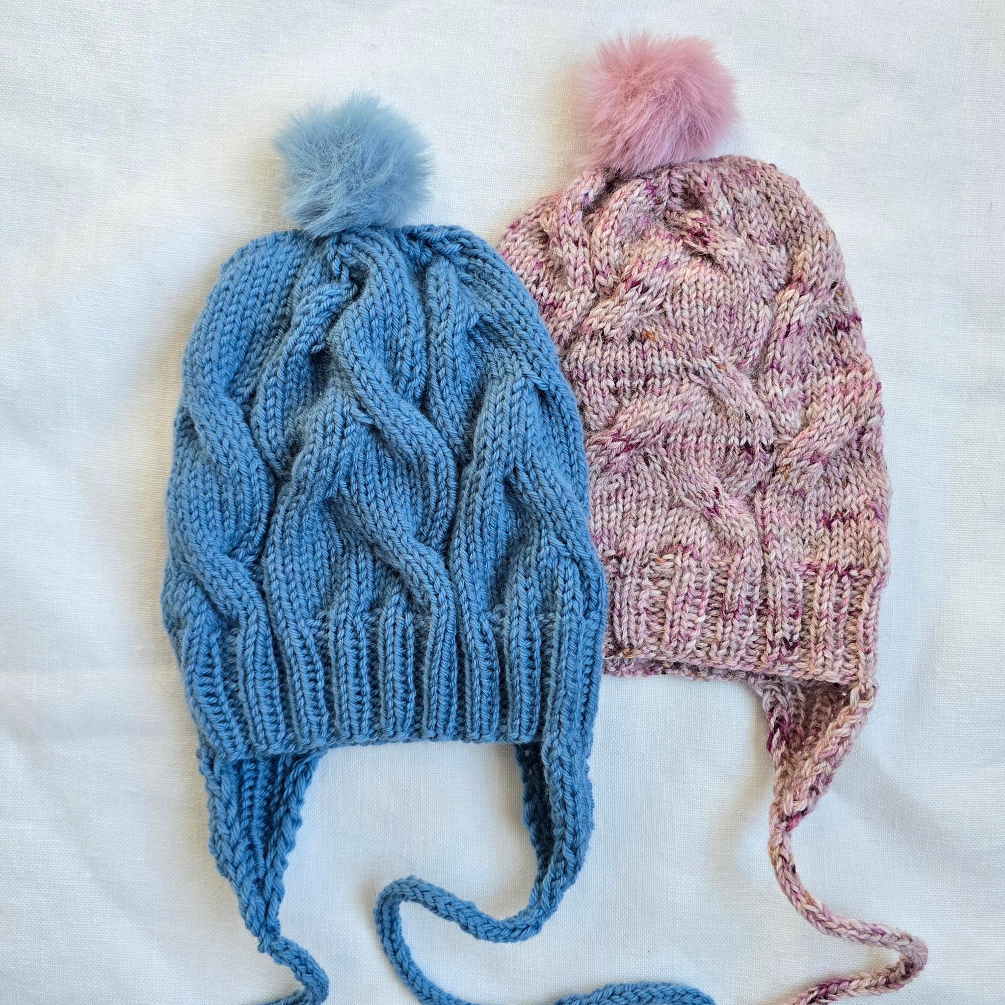 Luen strikkes med store fletter på hoveddelen. Pga flettene er luen ganske elastisk og vokser med barnet. Babyluen strikkes med øreklaffer for at den skal sitte godt på babyens hode. Det blir pent å ha på en dusk på luen til slutt, men den blir også fin uten dusk.